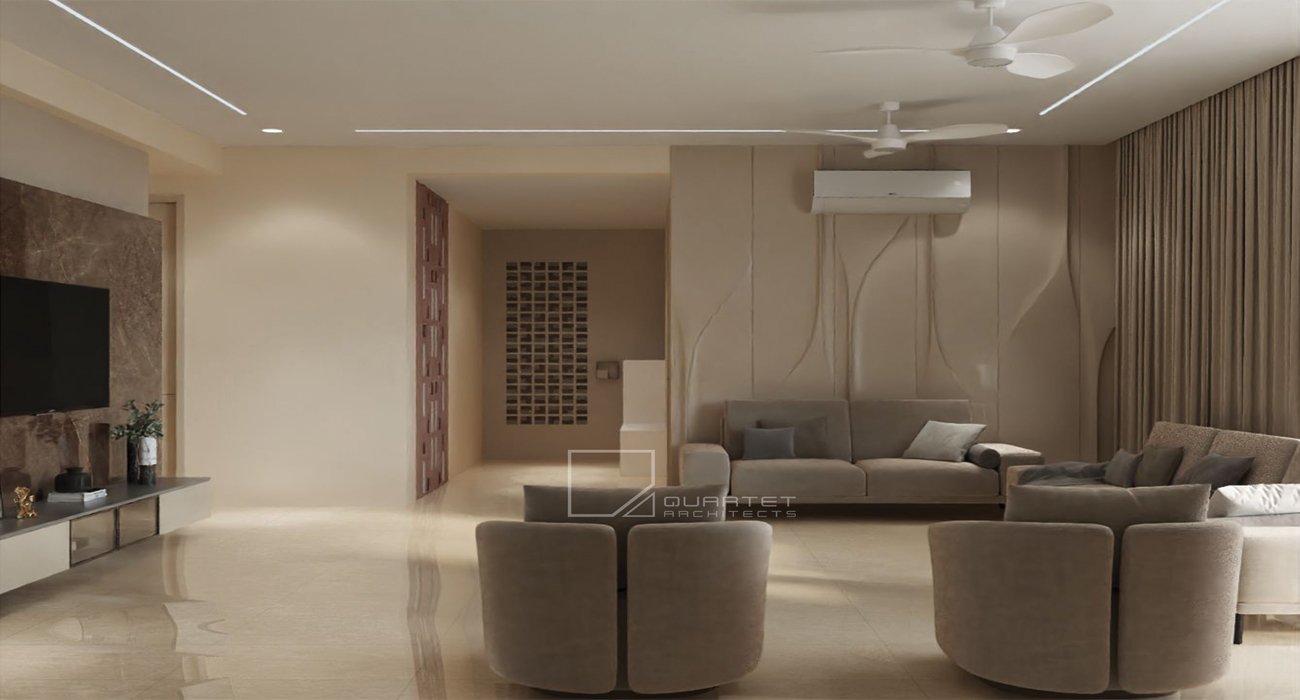This sophisticated residential interior design artfully balances comfort and elegance, creating a harmonious living space. The design philosophy embraces a warm neutral palette accented with rich wood...