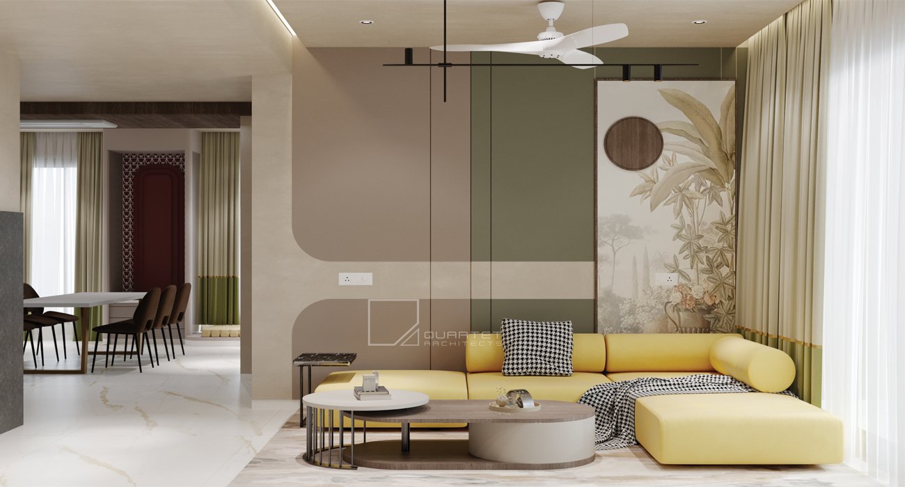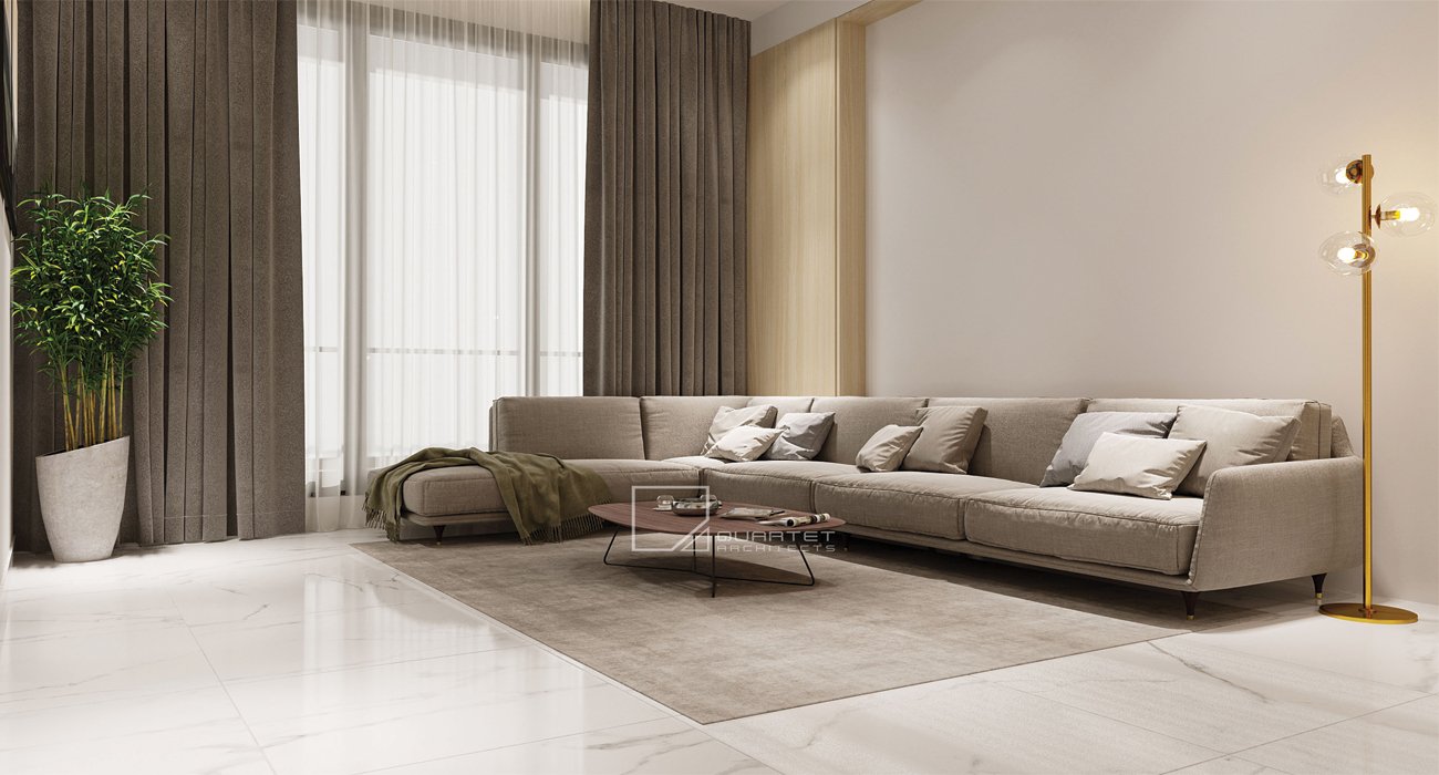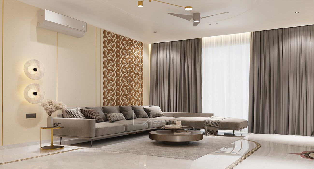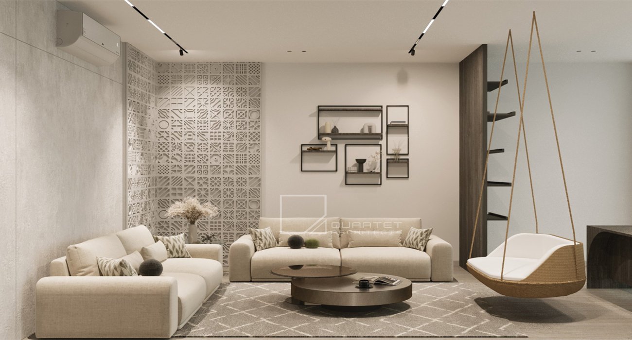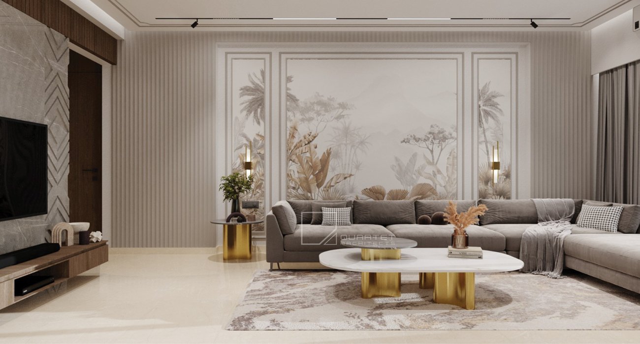 This sophisticated residential interior design artfully balances comfort and elegance, creating a harmonious living space. The design philosophy embraces a warm neutral palette accented with rich wood..